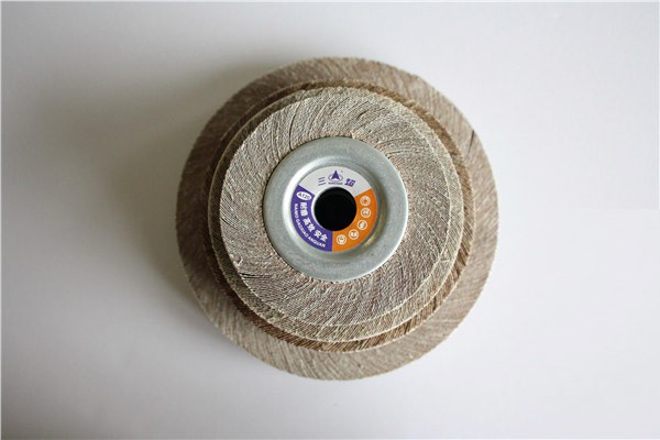 千葉輪,又名千頁(yè)輪、卡盤式頁(yè)輪,屬于涂附磨具的一種,每個(gè)產(chǎn)品以成百上千的紗布片粘合而成,故得名。它是以氧化鋁為磨料,基材為布基經(jīng)流水線制作成紗布,再由紗布層疊和全樹脂粘貼而成??ūP上下開凹槽將砂葉片固定在上下卡盤之間,砂葉片的內(nèi)側(cè)邊的兩端分別設(shè)置L形卡扣槽和緊固圈,緊固圈與卡扣槽固定連接,所述緊固圈經(jīng)膠液與卡扣槽固化粘結(jié)在一起,而成千頁(yè)輪,目前千葉輪分為直槽和U型槽口兩種。